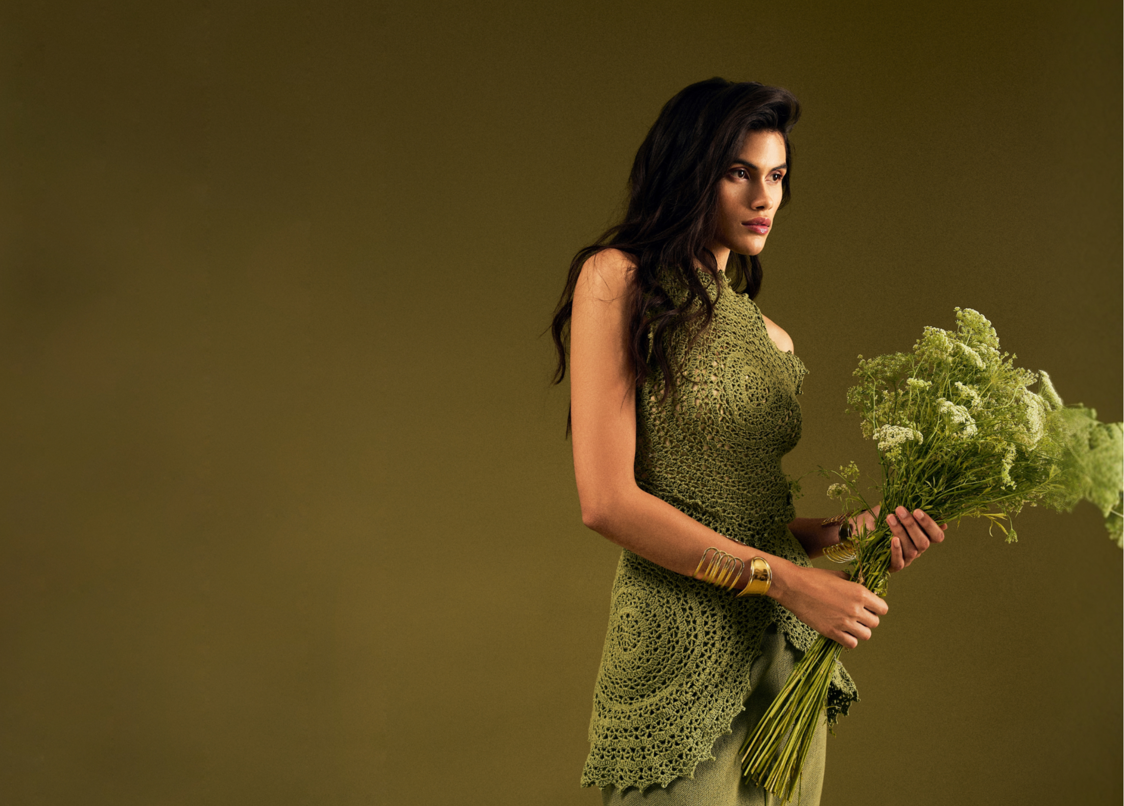 Her collection features techniques like hand knitting, crochet, and flat hand knits, using recycled and organic yarns such as banana yarns, polyester yarns, alpaca, merino, and cotton. “No plastics were used; the sequins are metal or glass,” she notes, emphasising sustainability.